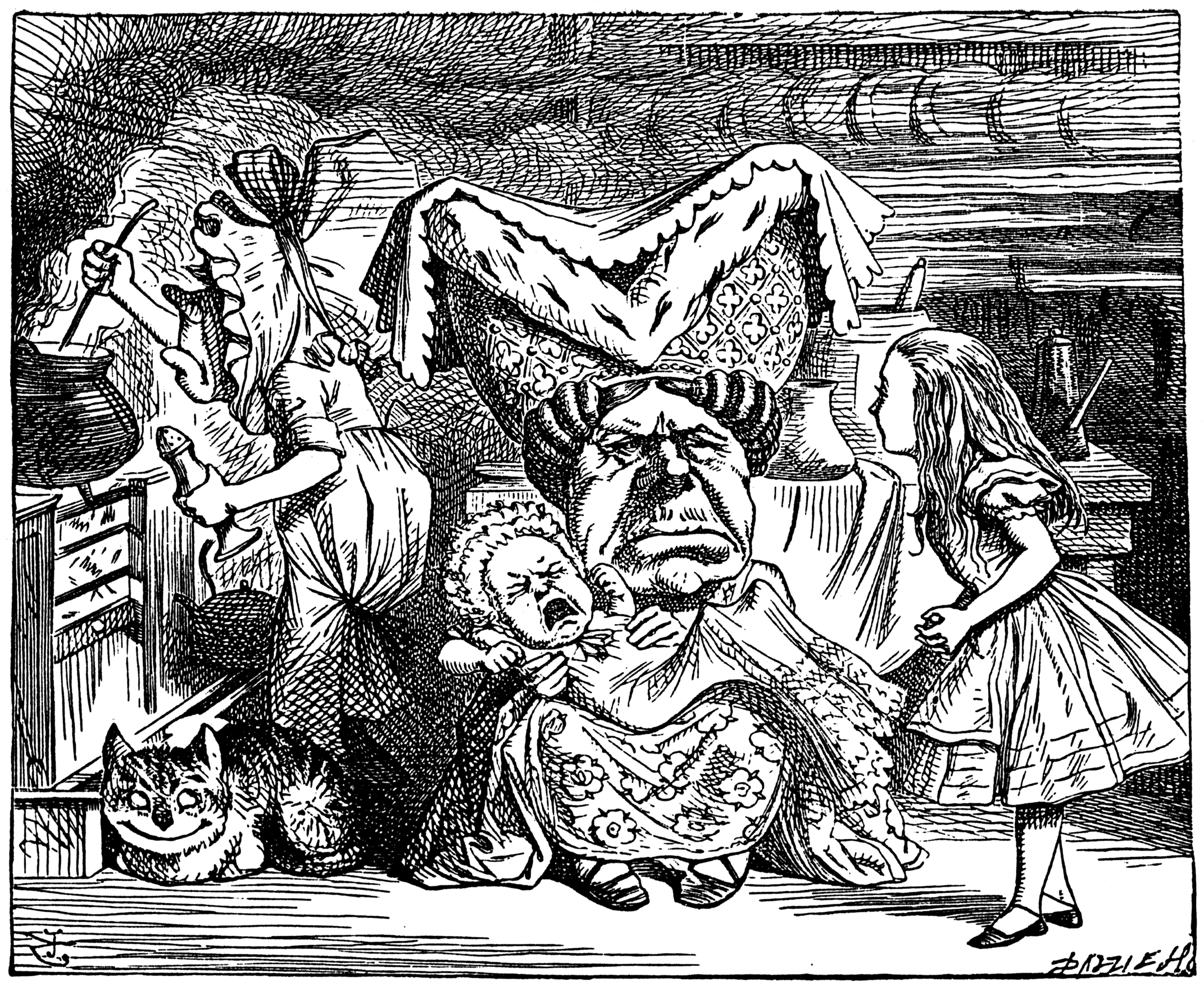 Герцогиня – уособлення грубої влади: трясе немовлям, наказує відрубати голову коту, цитує сентенції. Її чихання робить вразливою, розмиваючи авторитет. Немовля, що перетвориться на порося, – жертва цього світу, де діти страждають від “перепчення” вихованням.