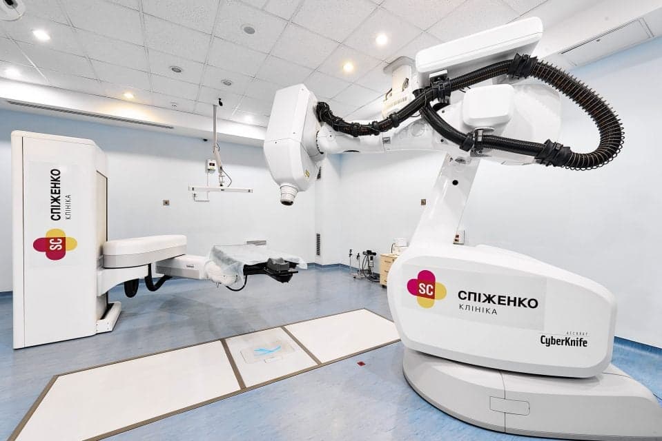 Стереотаксична радіохірургія (SRS/SBRT) – лазерний приціл проти раку. CyberKnife фокусує промені з точністю 0,5 мм, знищуючи мозкові метастази з локальним контролем 82-90% на 1-3 роки. Для хребта – 71% контроль на 2 роки, з мінімальною токсичністю.